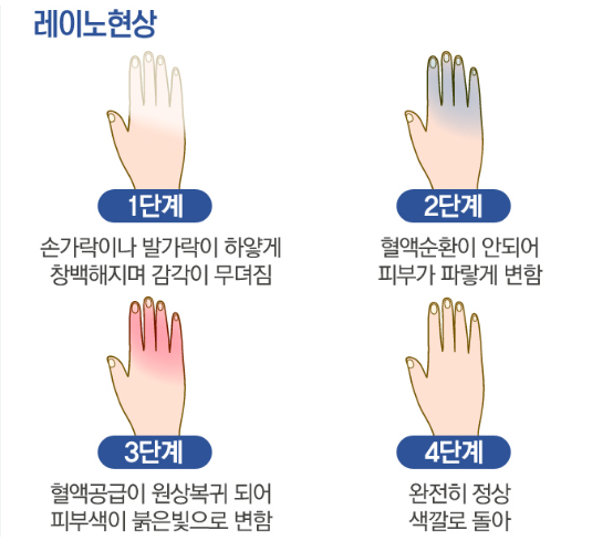 겨울에는 찬 공기로 인해 체열 손실이 급격하게 일어난다. 이때 몸은 중심 장기를 보호하기 위해 손·발·귀 같은 말초 부위로 가는 혈액을 우선적으로 줄인다. 즉, 생존을 위한 자연스러운 반응으로 손발이 차가워지는 것이다.