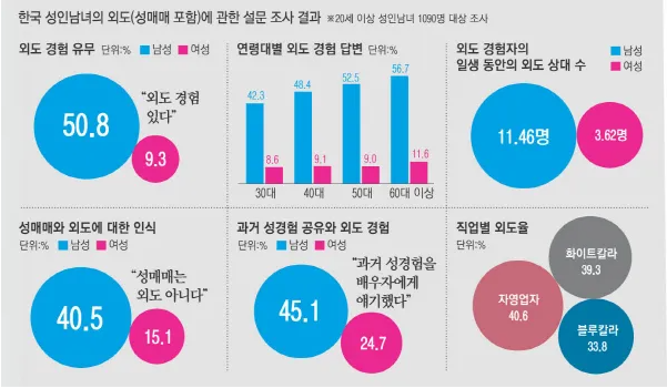 2016년 8월1일 라이나생명의 헬스.라이프매거진 '하이데이', 강동우 성의학연구소 공동으로 20세 이상 성인 남녀 1090명을 대상으로 실시 한 '한국인의 성생활' 설문조사 결과에 따르면 '성매매를 포함한 외도의 경험이 있느냐'는 질문에 남성(419명) 중 50.8%가 있다고 답했고 여성 응답자(365명) 중 9.3%가 외도 경험이 있다고 답변했다.
